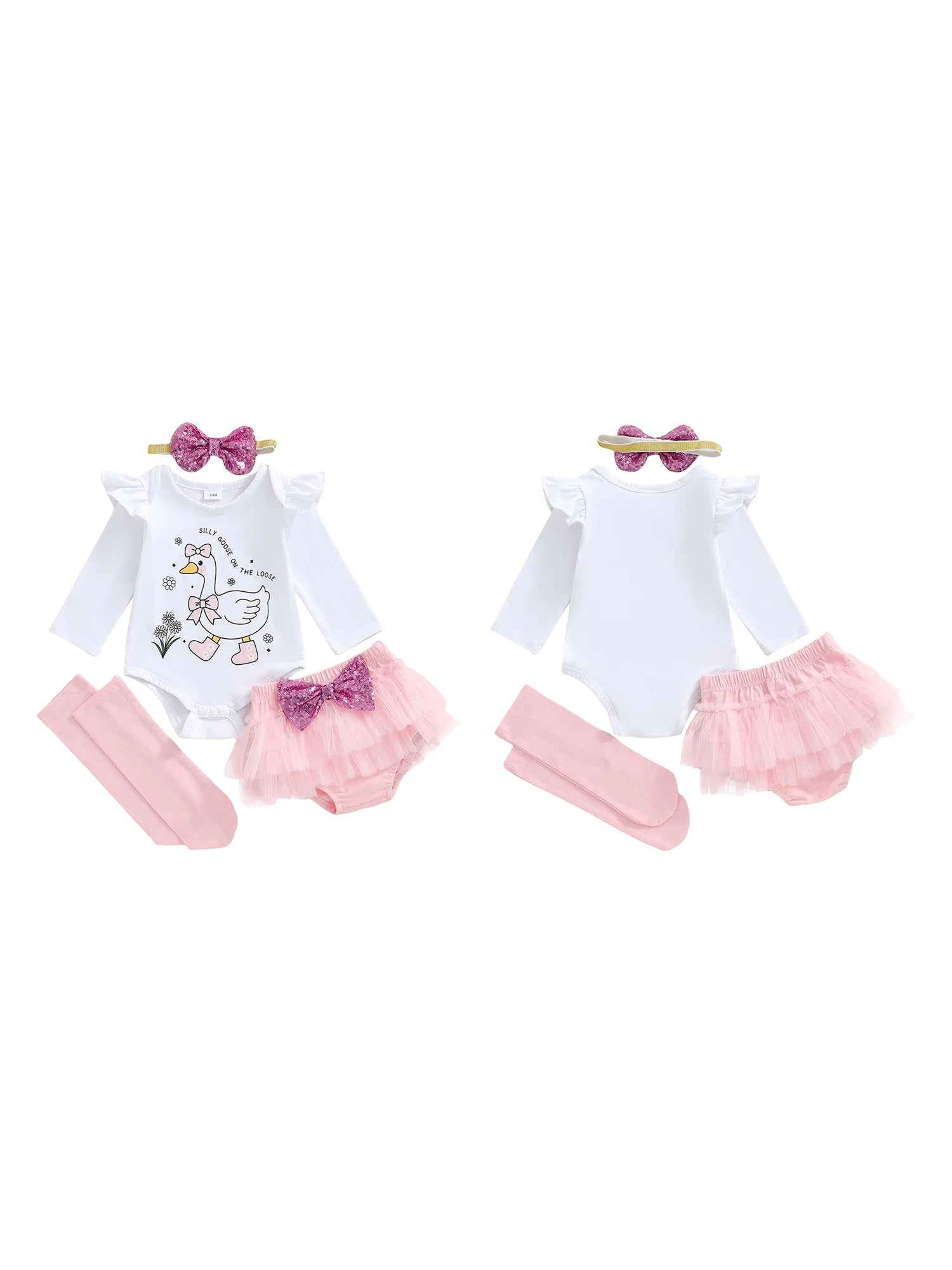 Adorable Baby Girl Outfit Set Romper With Duck Print Tulle Skirt Headband