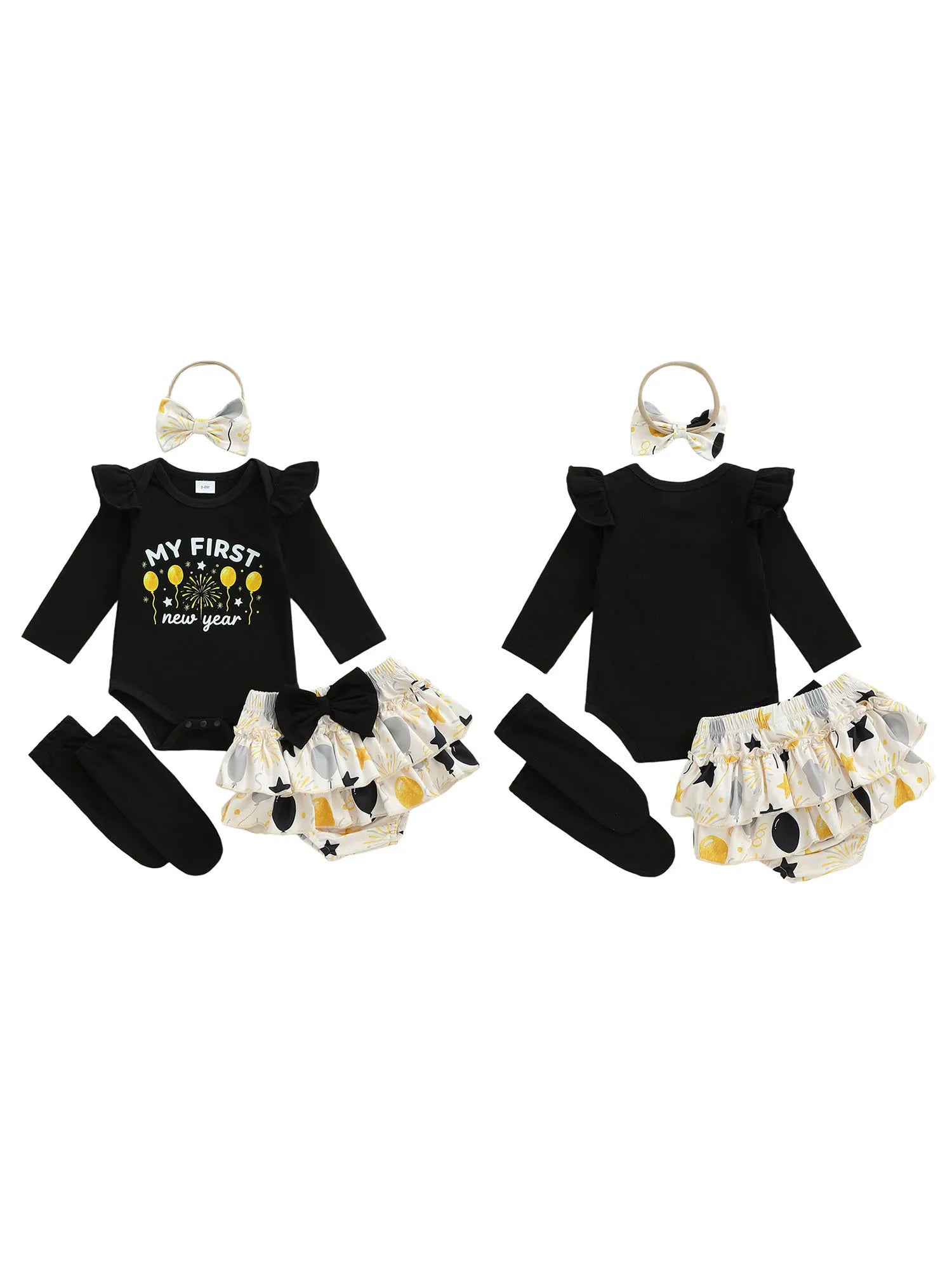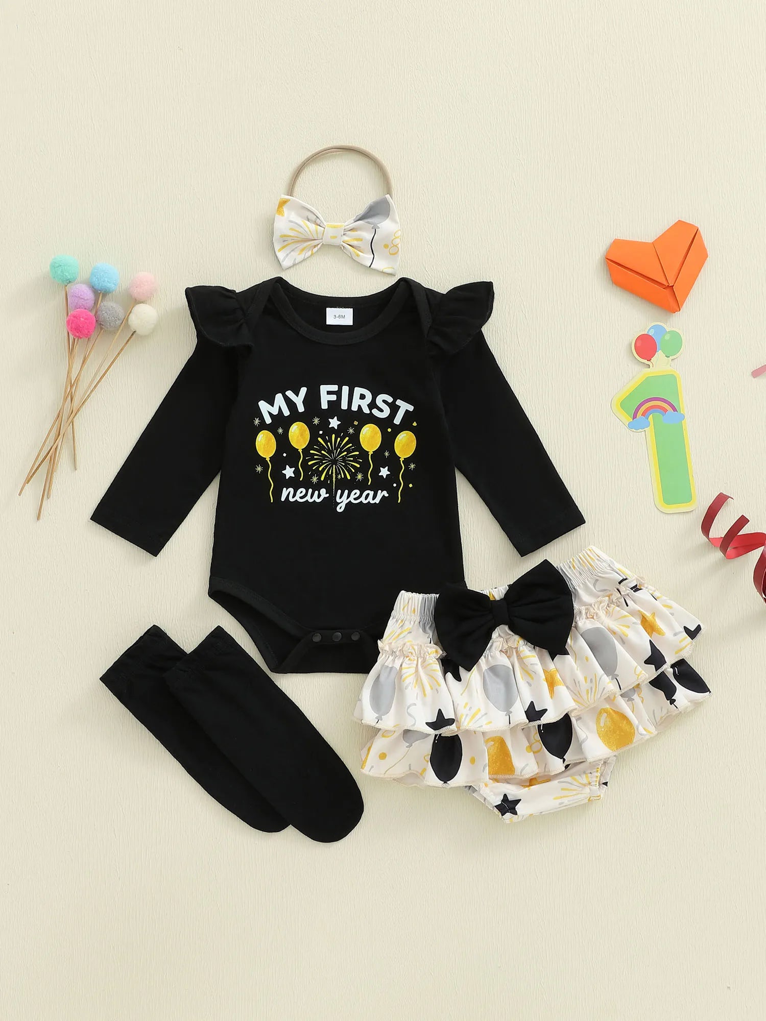 Adorable Baby Girl New Year Jumpsuit Set With Balloon Letter Print Headband