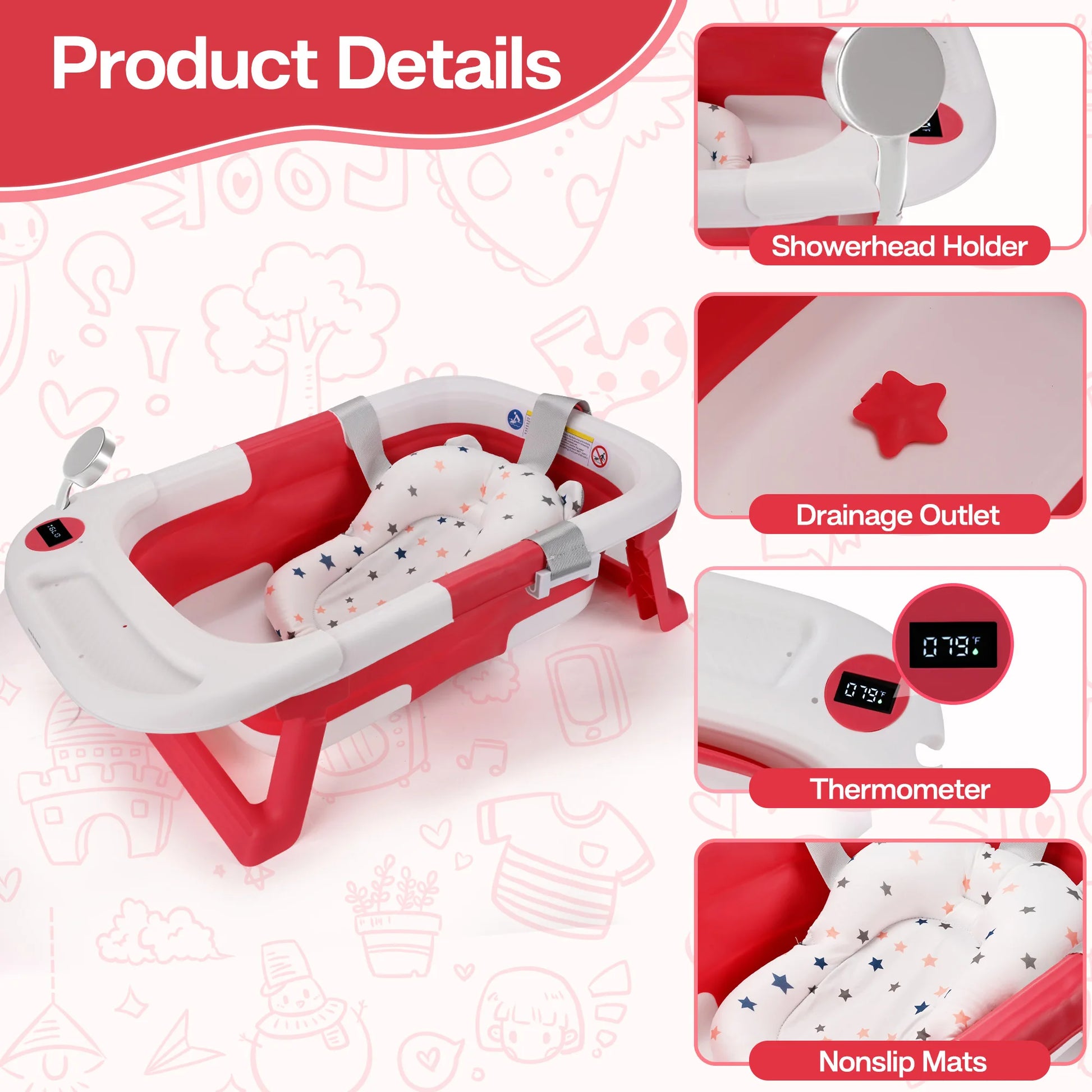Baby Bathtub with Soft Cushion and Thermometer Portable Travel Baby Tub for Newborn to Toddler Ages 0 to 36 Months